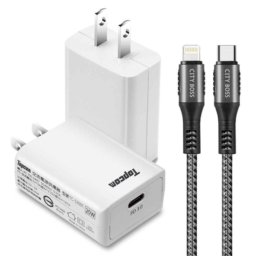 Topcom PD3.0+QC 快速充電器TC-S300C白+C to L PD耐彎折快充線1.2米