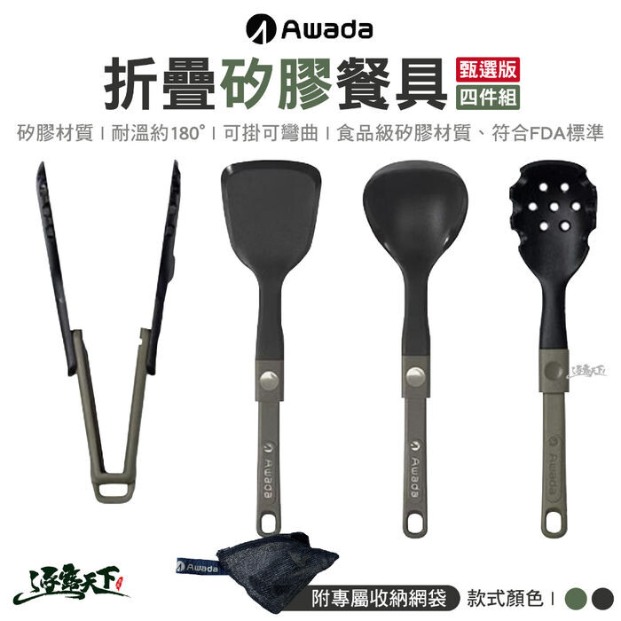 #AWADA #新款折疊矽膠餐具四件組 #甄選版 #綠色 #黑色 #炒鏟 #湯匙 #瀝水勺 #食物夾 #折疊餐具 #逐露天下 #露營 #露營用品