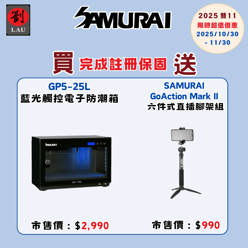 *SAMURAI防潮箱系列皆已投保產品責任險,敬請安心使用!分類 標籤 運送方式 廠商出貨,宅配到府 ( 限台灣本島地區,不含郵政信箱 ) 出貨時間 如確認交易條件無誤且有庫存,商品將於您付款成功後 1 個工作天內快速出貨 配送時間 出貨後物流到貨另需 1-3 個工作天,恕無法指定日期時段。可使用訂單查詢追蹤出貨與物流明細。 發票 由廠商開立 售後服務 松果購物全站商品享 7 天鑑賞期 ( 非試用期 ),請安心購買。鑑賞期內保持商品全新狀態且包裝完整,可線上申請退貨。詳情請參考退貨說明。生鮮食品、個人衛生用品及美妝用品,除商品本身有瑕疵,一經拆封將影響退換貨權益。特殊商品如到府安裝的家電類商品,安裝過後且測試正常,即視同當場驗貨完畢,不另享 7 天鑑賞期。 商品評價你可能也會喜歡(2025雙11活動註冊保固送粉刺機)Samurai GP5-15L 藍光觸控式電子防潮箱24890SAMURAI 新武士 GP5-150L 雙門式藍光觸控式電子防潮箱129000Samurai 新武士GP5-30L 藍光觸控式電子防潮箱39902Samurai 新武士 GP5-36L 藍光觸控式電子防潮箱44900Samurai 新武士 GP5-90L 藍光觸控式電子防潮箱79890Samurai 新武士 GP5-60L 藍光觸控式電子防潮箱59890SAMURAI 新武士 GP5-36LW 藍光木紋觸控式電子防潮箱49890Samurai GP5-120L 藍光觸控式電子防潮箱105900SAMURAI UVA藍光殺菌觸控式電子防潮箱 UVA-06868900SAMURAI UVA藍光殺菌觸控式電子防潮箱 UVA-04053890SAMURAI UVA藍光殺菌觸控式電子防潮箱 UVA-02834900SAMURAI GP5-80L 藍炫光觸碰式電子防潮箱<長鏡頭專用>75900(最後一台全新品)Samurai 新武士 GP2-150L防潮箱99980Samurai新武士 Outdoor 180 高度177公分輕量化專業油壓攝錄影用反折三腳架49802人購買0SAMURAI 新武士 100x150mm 漸層減光鏡(僅一個)9900SAMURAI 新武士 170x190mm 減三格 漸層減光鏡19800Samurai DX 999 新武士 攝錄影 專業 鋁合金 三腳架 單握把 旅遊 搖桿 雲台 穩定13000極簡約 鋁合金雙支架 APPLE iPad 11 第11代 11吋 2025平板電腦 保護殼 支點殼7921極簡約 鋁合金雙支架 Apple iPad Air7 2025版 11吋 平板電腦 保護殼 支點殼7920