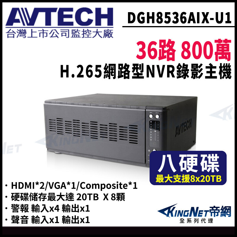 AVTECH 陞泰 DGH8536AIX-U1 36路NVR IP網路型錄影主機 8顆硬碟 AI智慧
