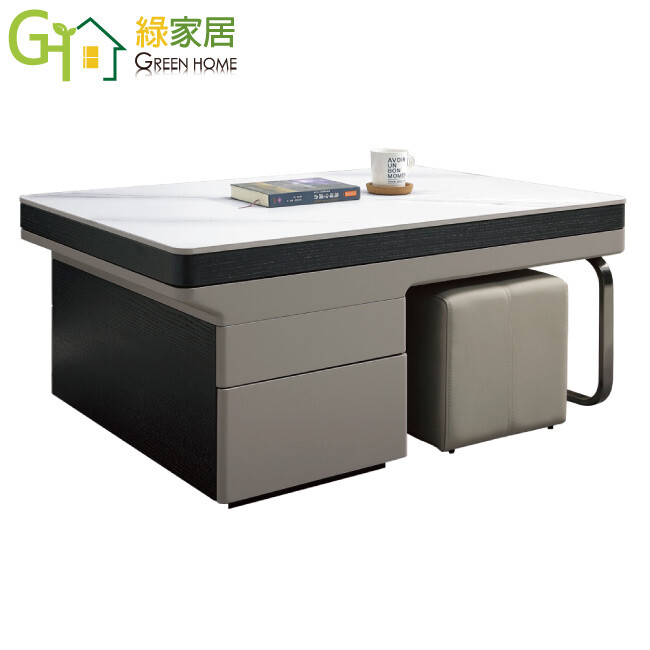 【綠家居】弗斯3.5尺雲紋石面升降大茶几(桌面可升降&橫移+附贈單個皮革圓凳)