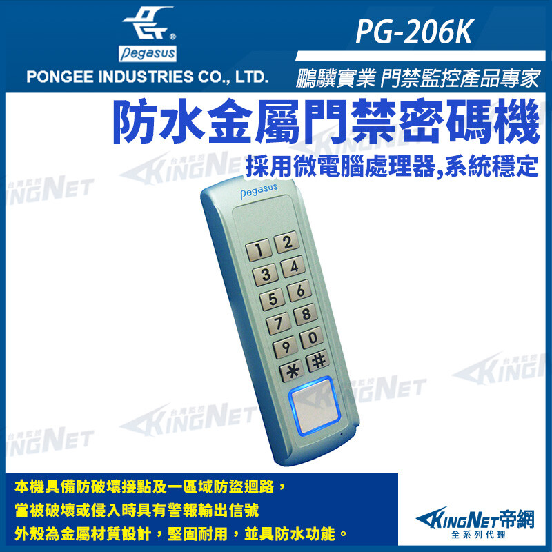 帝網監視器 鵬驥 Pegasus PG-206K 防水金屬門禁密碼機 1~7組密碼