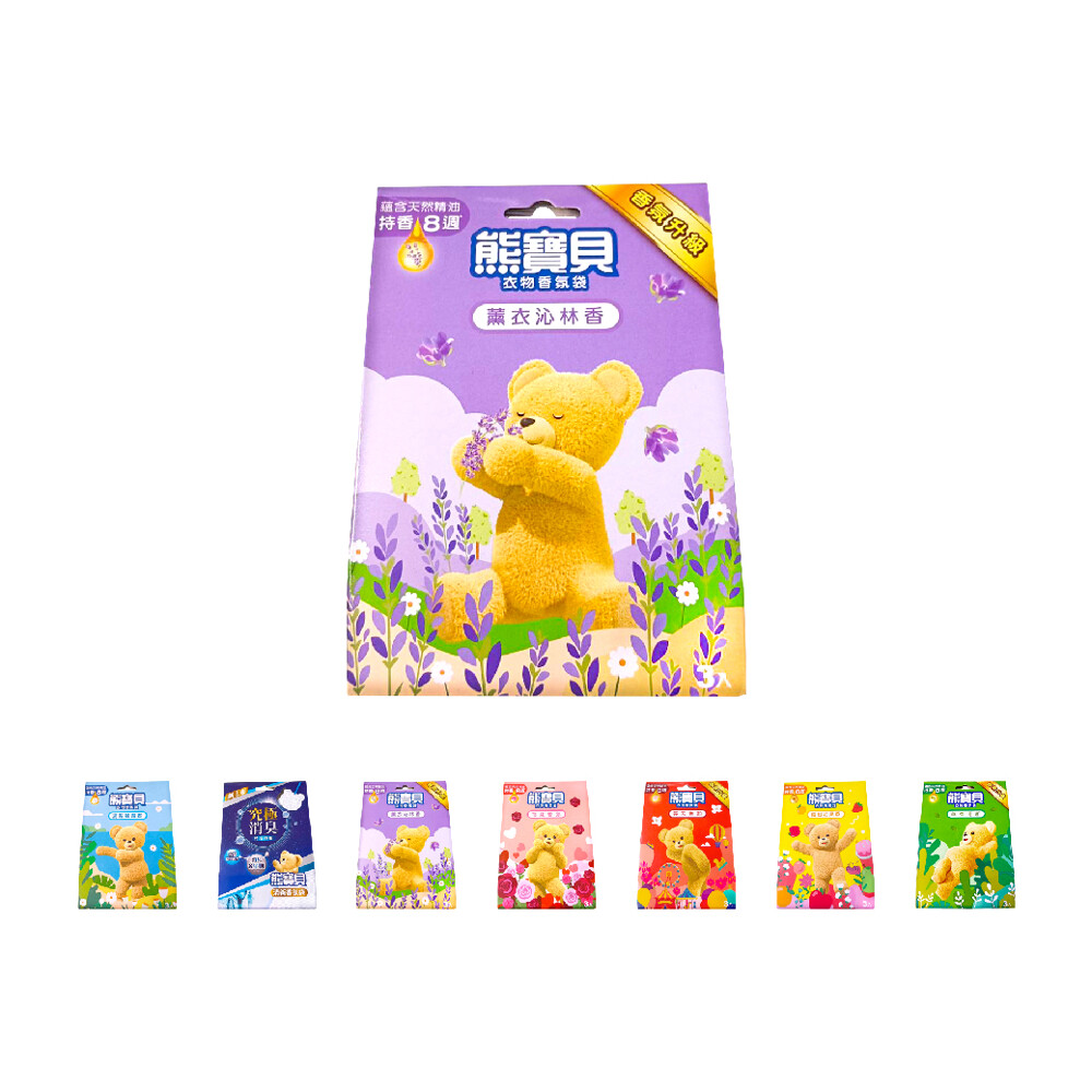 優惠方案方案1 10入 售價$690 均價$69 方案2 20入 售價$1370 均價$69 方案3 30入 售價$2040 均價$68 商品介紹熊寶貝 衣物香氛袋系列 (3包/盒)