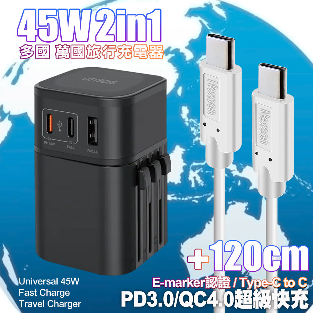 CB COT-976 45W二合一萬國旅行充電器-黑+NEXSON E-Mark認證Type-C to Type-C快充線-白