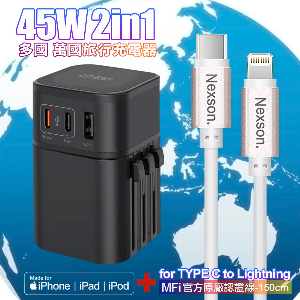 CB COT-976 45W二合一萬國旅行充電器-黑+NEXSON 蘋果認證 Type-C to Lightning PD快充線-玫瑰金