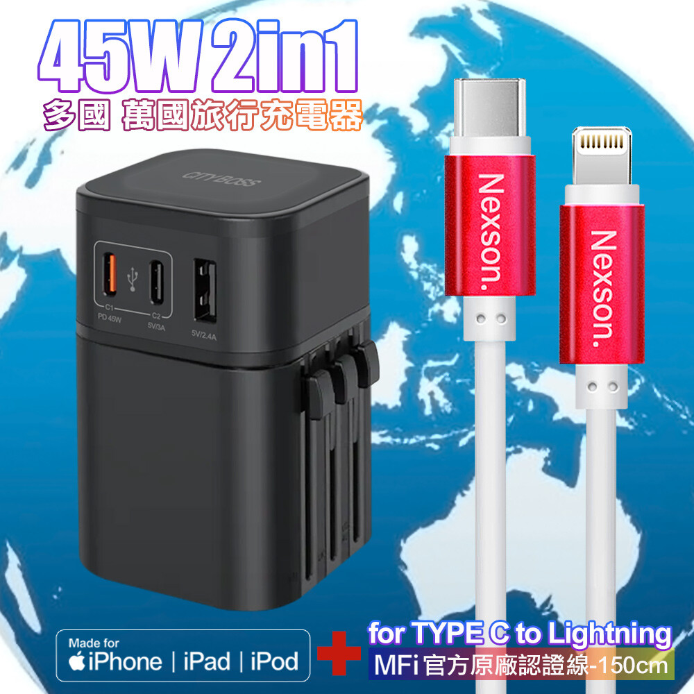 CB COT-976 45W二合一萬國旅行充電器-黑+NEXSON 蘋果認證 Type-C to Lightning PD快充線-紅