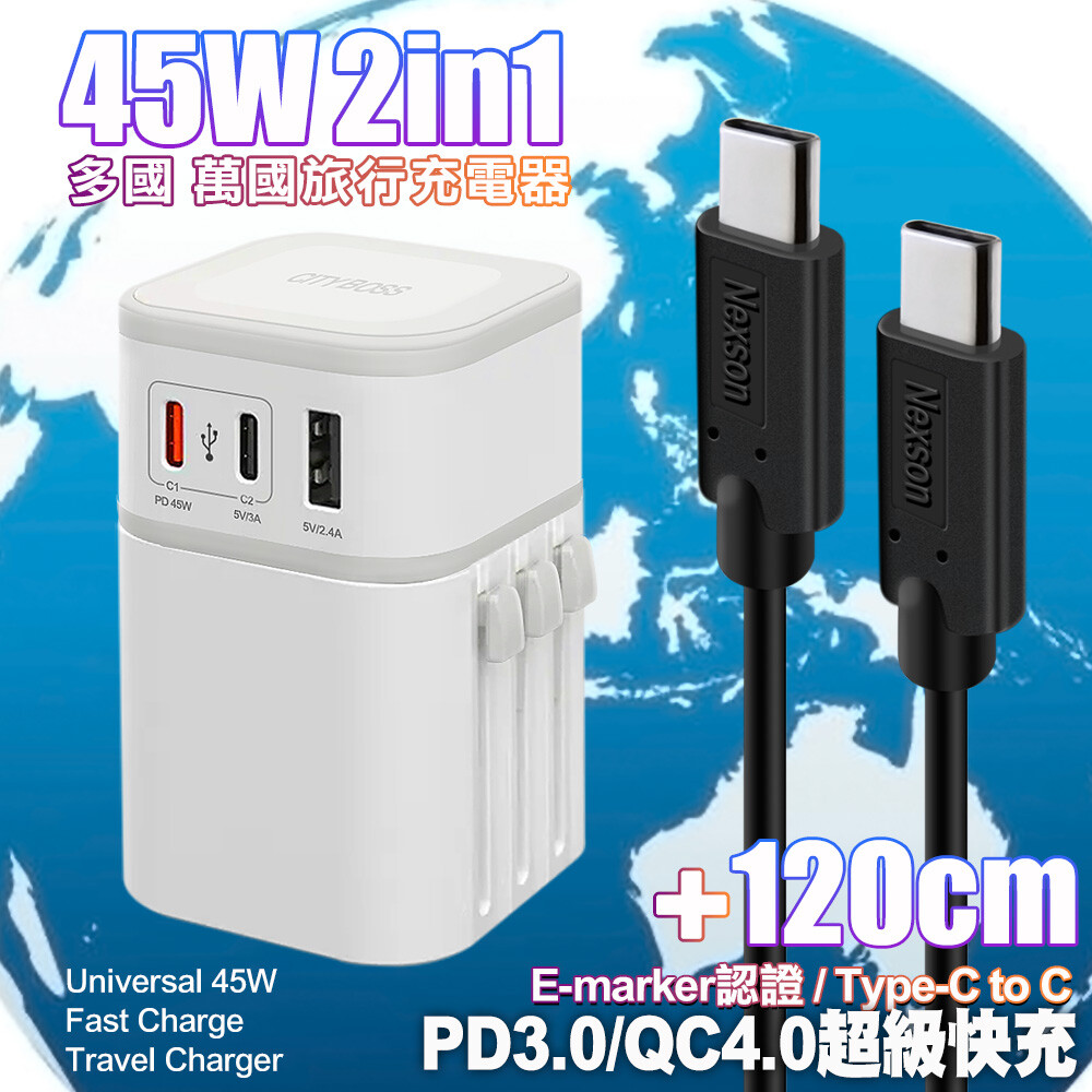 CB COT-976 45W二合一萬國旅行充電器-白+NEXSON E-Mark認證Type-C to Type-C快充線120cm-黑