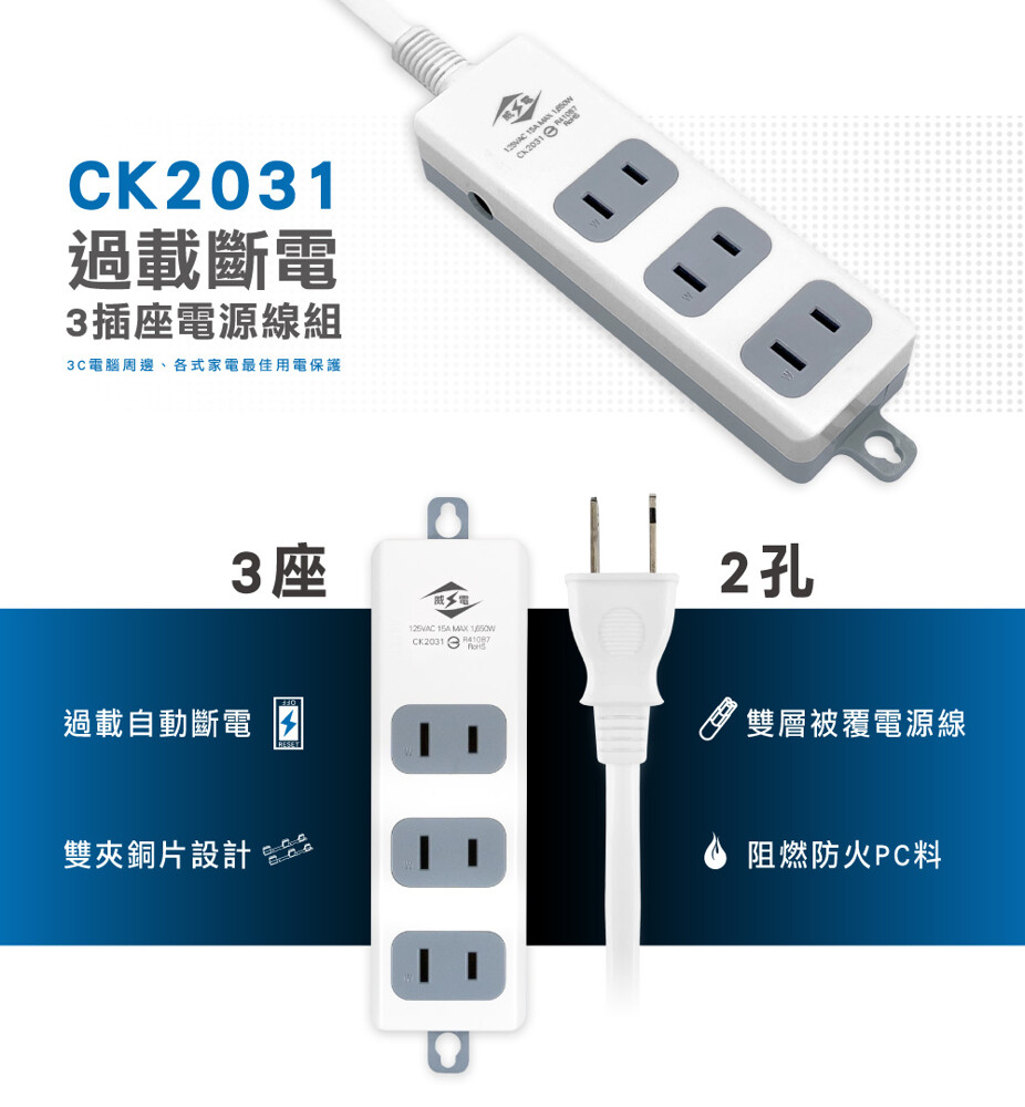 🔹2孔 3插座 延長線 過載斷電 1.8米 電源插頭 最新安規 電源線 轉接器 BSMI【CK009】