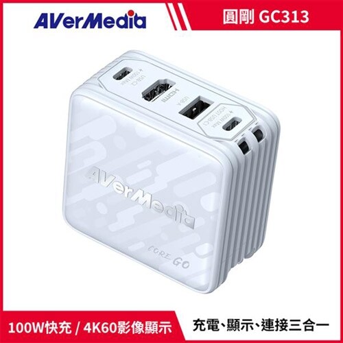 出貨天數一般付款後 2 個工作天出貨運送方式宅配運費$100商品詳情評價更多推薦優惠方案方案1 1入 售價$2290 均價$2290 商品介紹隨時隨地滿足您的需求,CORE GO GC313影像傳輸充電器不只是充電神器,更是滿足電力與資料傳輸需求的全方位解決方案。能同時為三台設備充電,並提供穩定的資料傳輸功能,讓您無論在家、辦公室或旅行中,都能隨時保持連接與充電。它能快速充電並無縫連接至外接螢幕顯示器,是旅行、商務簡報和大螢幕多媒體娛樂追劇的理想夥伴。此外,即使未連接電源插座,GC313也能作為集線器使用,支援資料傳輸與顯示功能。,隨時隨地同時為三台設備充電,支援多達三台設備同時充電,提升便利性與效率。無需攜帶多個充電器,節省空間、減少雜亂,讓您的生活更輕鬆。,更安全、更快速、更輕便,我們的100W GaN充電器不僅提供高效能充電,還確保充電安全穩定,大幅縮短充電時間。輕便設計讓攜帶更加輕鬆便利,無論何時何地,都能保持高效率的裝置使用。,購買圓剛產品,即可享有 2年保固。另外只要註冊成為圓剛AVerMedia會員,即可免費延長1年保固,讓您的產品保固升級為 2+1年超值保護更安心!,原廠型號:GC313(白),適用介面:USB 2.0,壓縮晶片:AVerMediaCORE GO GC313,搭載端子:USB-C/USB-A/HDMI,螢幕解析度:最高4K60HZ解析度,影片剪輯功能:無,製作VCD:無,製作DVD:無,壓縮格式:MJPEG,壓縮方式:硬體,系統需求:256GB或更大容量的SSD/至少8GB的RAM,適用作業系統:Windws 11,附件:USB Type-C 轉 Type-C 傳輸線 (2公尺)/可更換插頭(歐規和英規) 快速安裝手冊,●商品有任何問題都可以聊聊與我們詢問