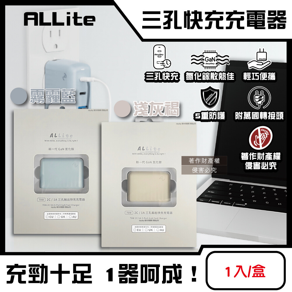 ●內容物:充電器1入、UK/EU/AU萬國轉接頭1組。