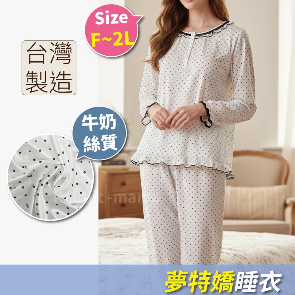 台灣製造 夢特嬌睡衣 長袖褲裝睡衣 57501 水玉點點 牛奶絲質 開襟 成套褲裝睡衣 加大尺碼睡衣