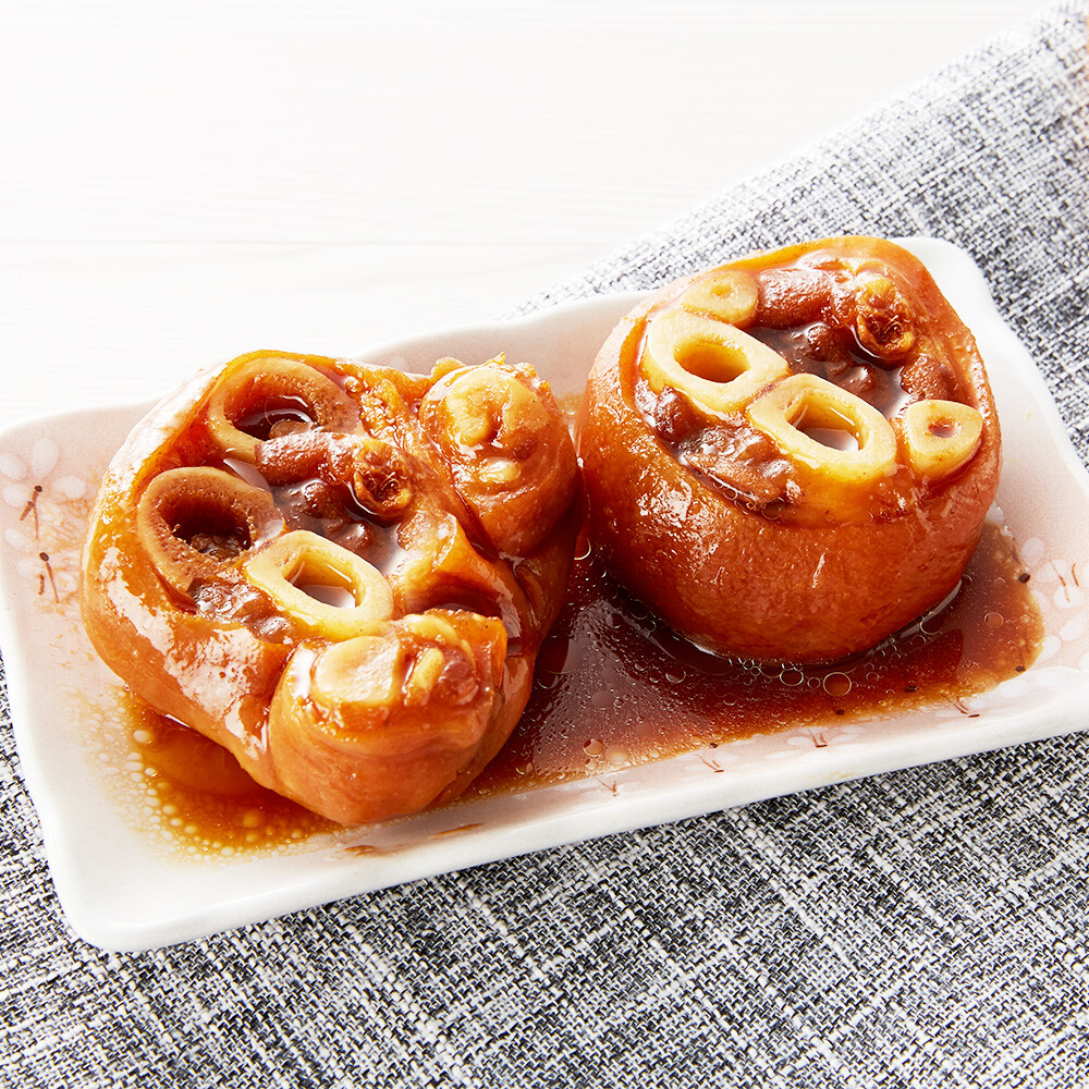 成分:豬腳(台灣)、醬油、鹽、紅糖、品質改良劑(多磷酸鈉、焦磷酸鈉)、調味劑(L-麩氨酸鈉、5' -鳥嘌呤核苷磷酸二鈉、5’-次黃嘌呤核苷磷酸二鈉、琥珀酸二鈉)、辛香料(白胡椒粉、蒜粉、油桂粉、百草、月桂草、甘草、八角、孜然)、肉精粉(酸水解醬油、葡萄糖漿、雞肉抽出物、DL-氨基丙酸、酵母抽出物、燻味香料粉(乳糖、香料、二氧化矽)、食用黃色5號、膨脹劑(碳酸氫鈉)。