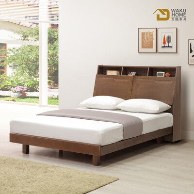 WAKUHOME 瓦酷家具Yamy5尺標準雙人淺胡桃實木床組(床頭箱-床架-附USB插座) A010