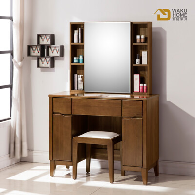 WAKUHOME 瓦酷家具Yamy淺胡桃實木3.3尺鏡台椅組 (實木面板/檯面/座腳)